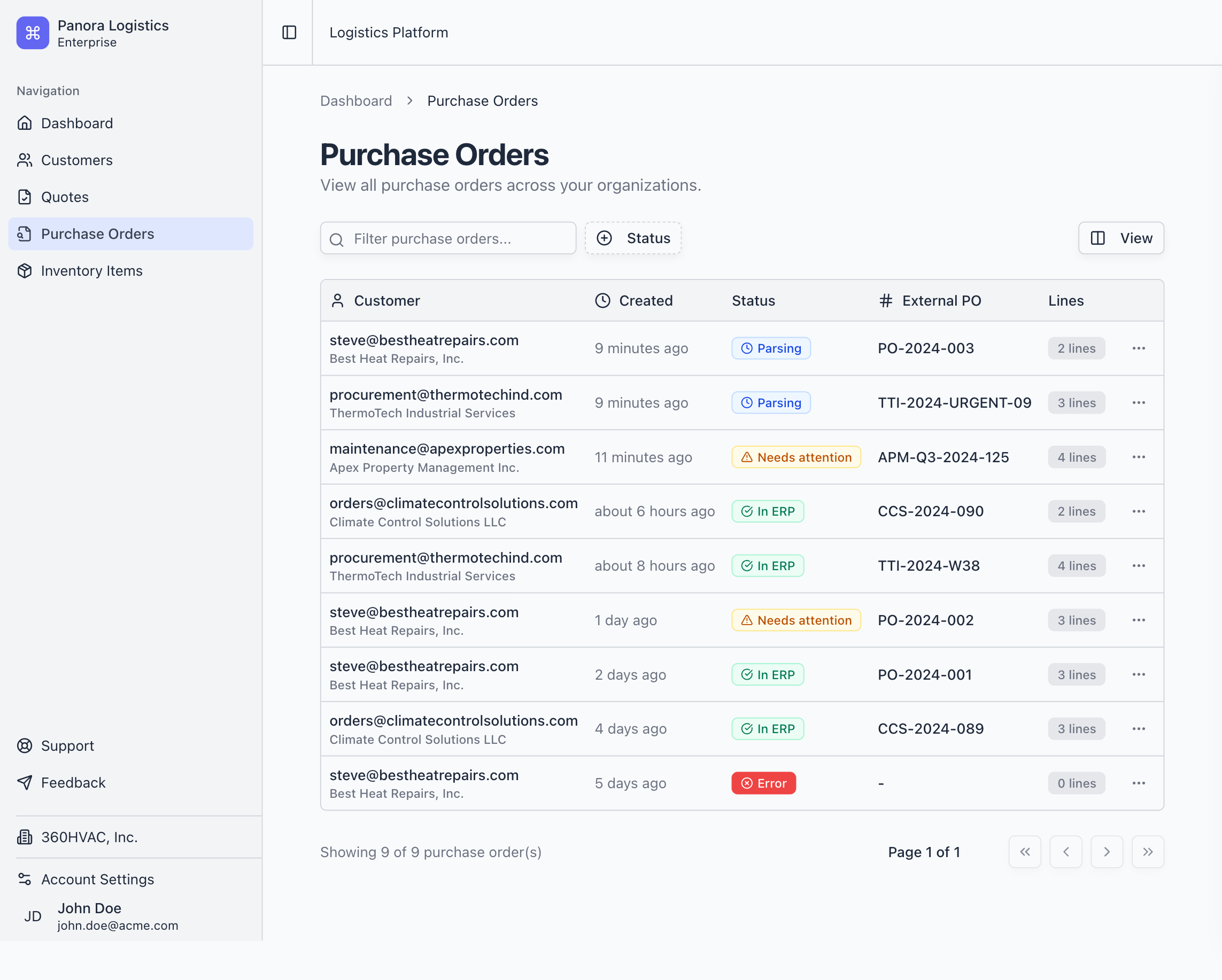 You didn’t hire smart people to type purchase orders into an ERP all day. Panora handles the data entry mess so your team can actually focus on customers and revenue.